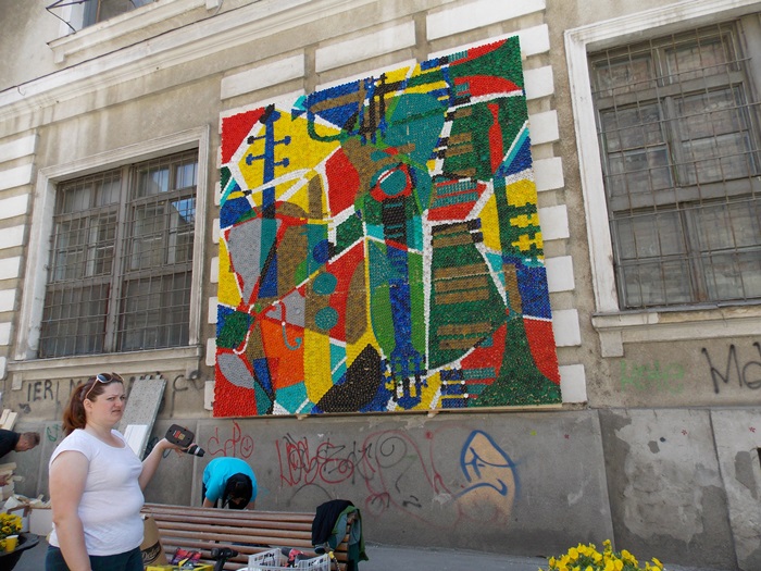 Cele 8 tablouri au fost realizate din peste 100.000 de capace de plastic si vor ramane pe pietonala pana in 24 mai. 40 de voluntari au lucrat la ele, timp de 5 saptamani.
