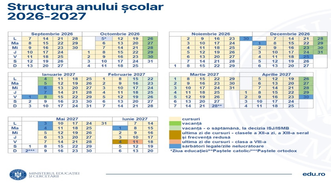 Cursurile se vor încheia în 18 iunie 2027. Elevii claselor a VIII-a termină şcoala în 11 iunie 2027, iar cei din clasele a XII-a, la zi, a XIII-a seral si frecvență redusă în 4 iunie 2027.