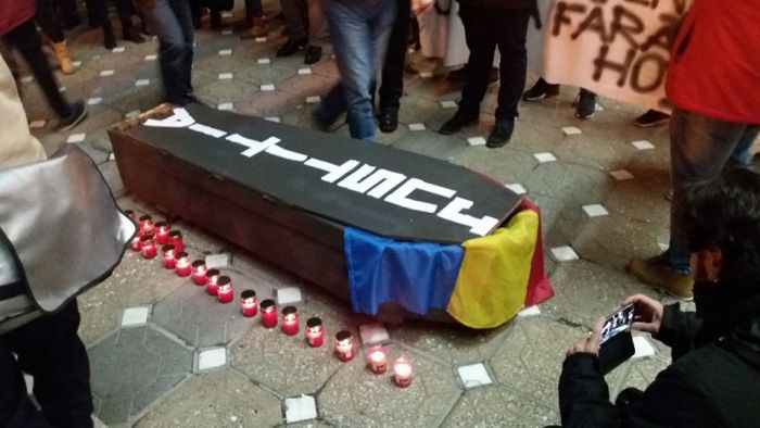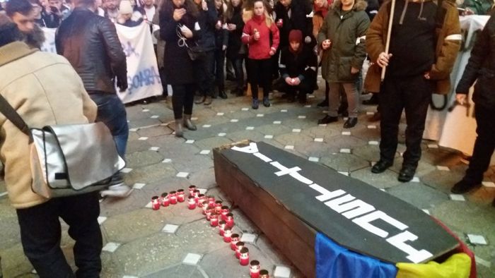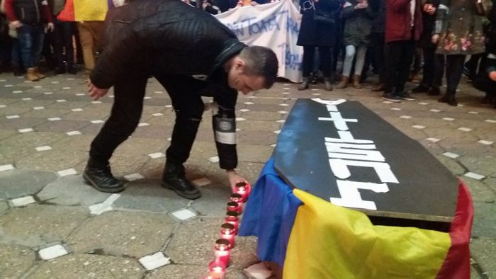 In fata Operei, sicriul a fost asezat pe platou, iar in jurul lui, protestatarii au aprins candele.