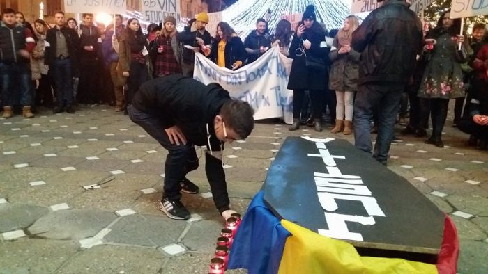 Tinerii au venit incolonati, in Complexul Studentesc, pana in Piata Operei, purtand pe umeri un sicriu invelit in drapelul tricolor si pe care au scris “Justitie”.