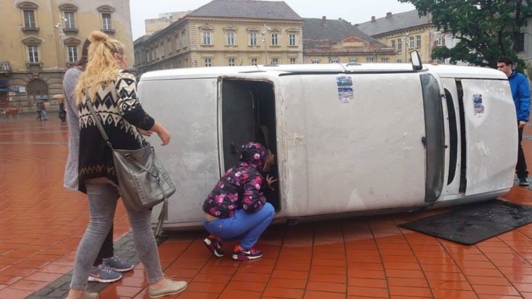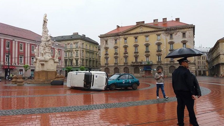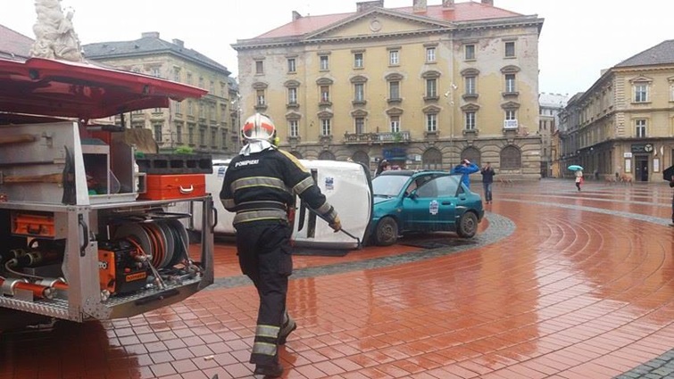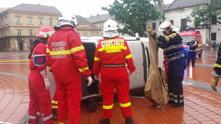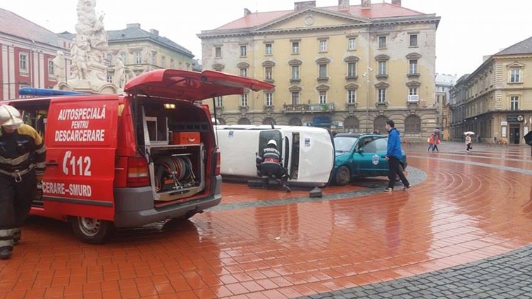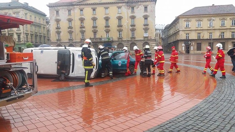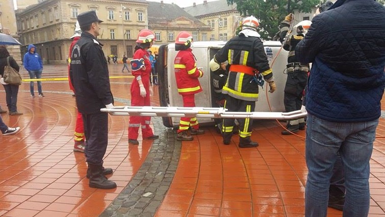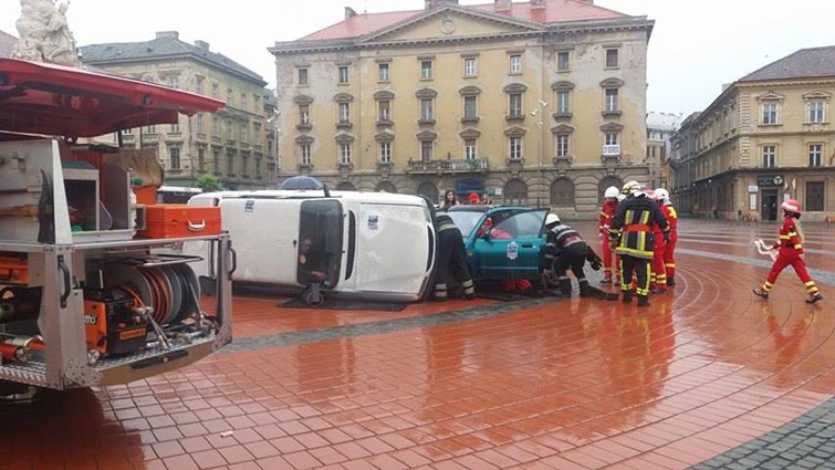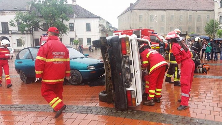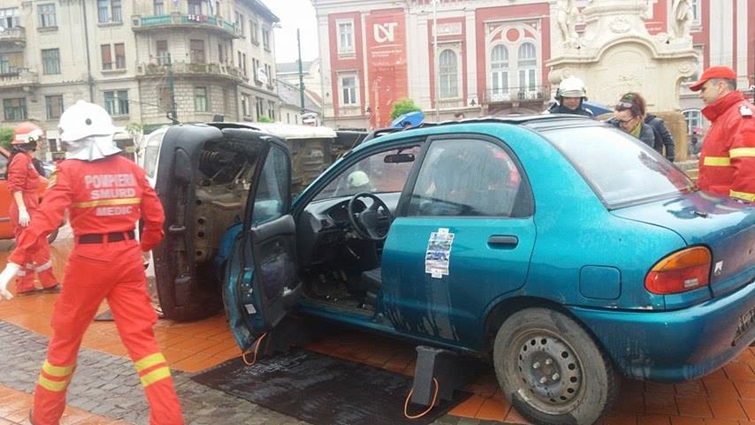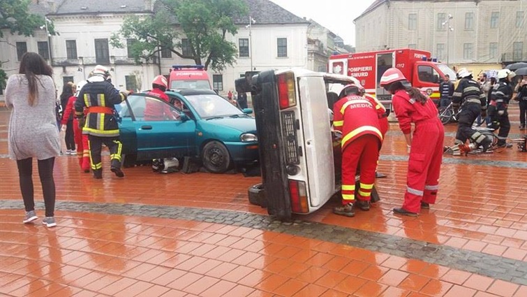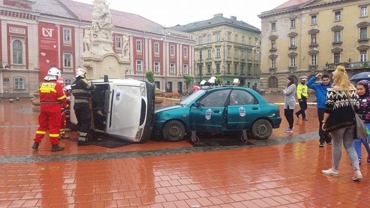 TIMISOARA. Cei care au trecut prin Piata Libertatii din Timisoara au putut vedea indeaproape simularea unui accident rutier grav. Doua masini au fost distruse, iar 5 persoane au fost ranite, in urma unui accident de circulatie, produs din cauza unui tanar care bause inainte sa se urce la volan.