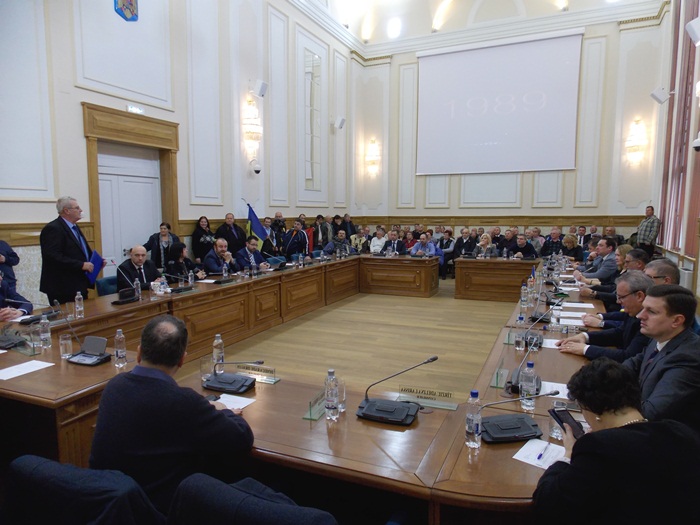 Pe durata intregii sedinte festive, pe unul dintre ecranele din sala de consiliu au rulat imagini din perioada comunismului, din perioada Revolutiei, dar si imagini cu cei care s-au jertfit in Decembrie 1989.