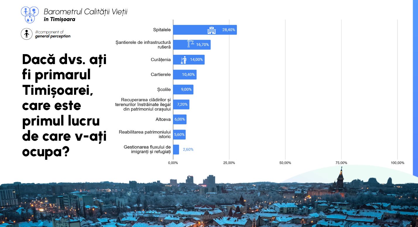 La întrebarea “Dacă dumneavoastră ați fi primarul Timișoarei, care este primul lucru de care v-ați ocupă?“, în ordine, răspunsurile au fost: spitalele – 28,40%, șantierele de infrastructură rutieră – 16,7%, curățenia – 14%, cartierele – 10,40%, școlile – 9% și recuperarea terenurilor și clădirilor înstrăinate ilegal din patrimoniul orașului – 7,20%.