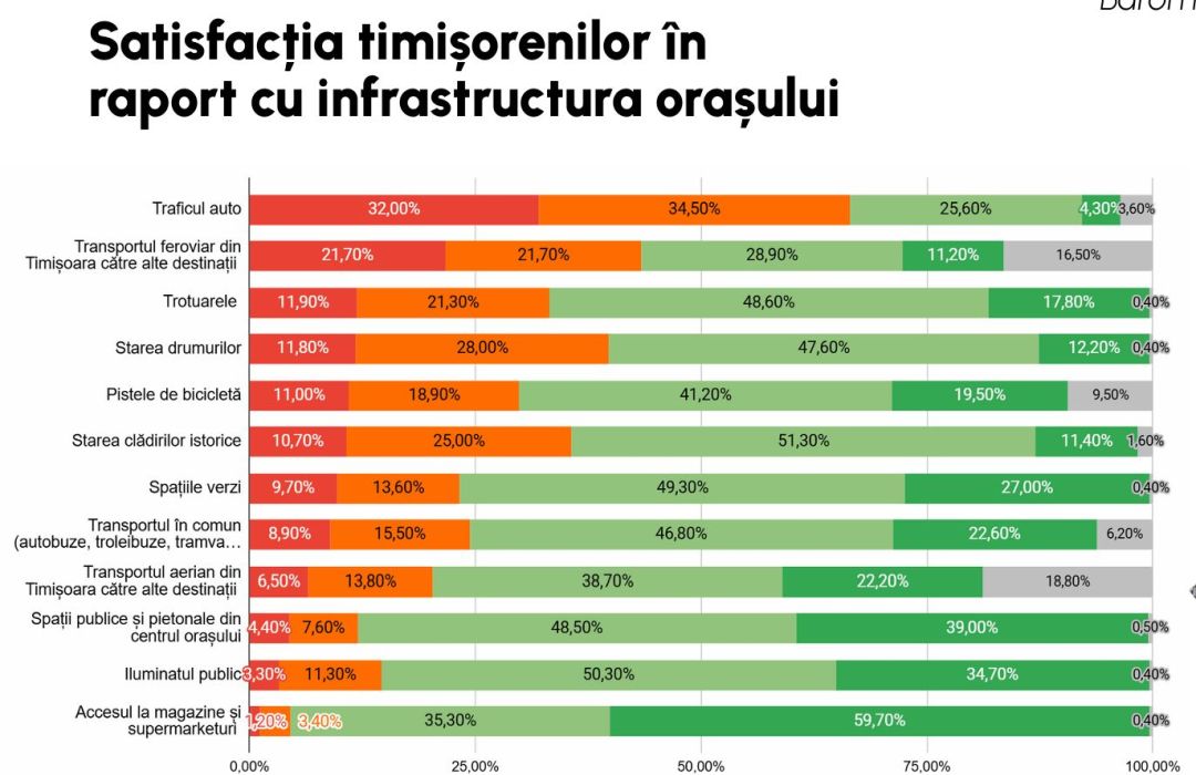 La procente, însă, lucrurile arată bine pentru Primăria Timișoara: 70% dintre respondenți sunt mulțumiți și foarte mulțumiți de felul în care circulă tramvaiele, autobuzele și troleibuzele prin oraș.