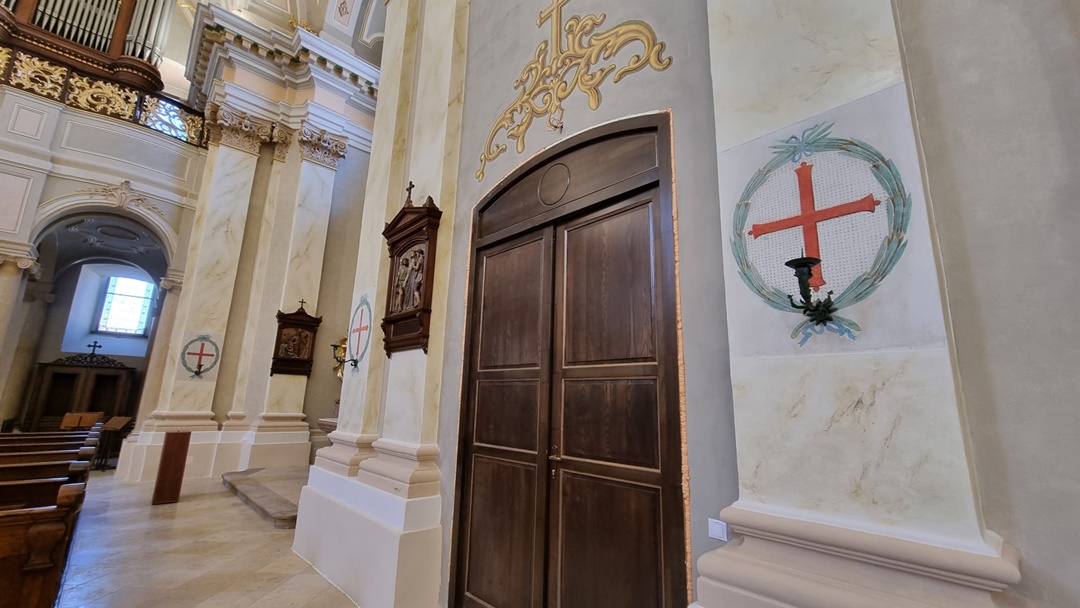 In timpul sfintei Liturghii vom unge aceste 12 cruci care sunt cruci de la consacrare. Trebuie stiut ca aceste cruci sunt cele originale. Cand au renovat au vopsit, au zugravit si au facut cruci mai mici si cand restauratorii au observat, atunci pe acele cruci le-au luat de acolo si au iesit la iveala aceste 12 cruci. De ce sunt 12? Eu cred ca pentru ca biserica este construita pe temelia celor 12 apostoli si de aceea, biserica reprezinta intreaga biserica care e construita sau este cladita pe cei 12 apostoli.