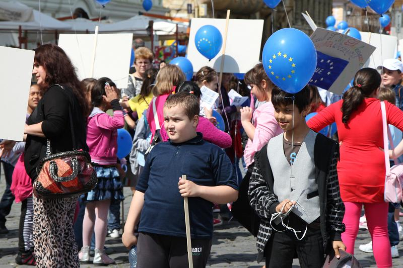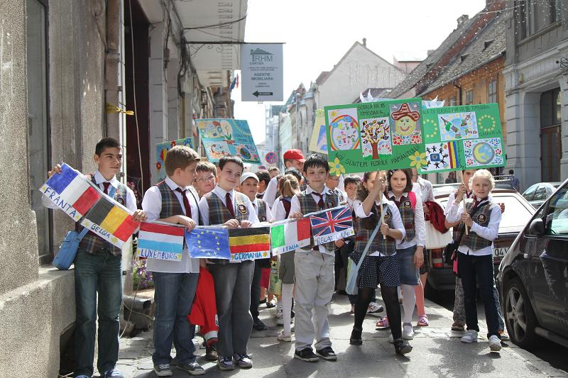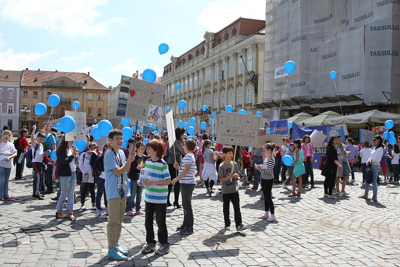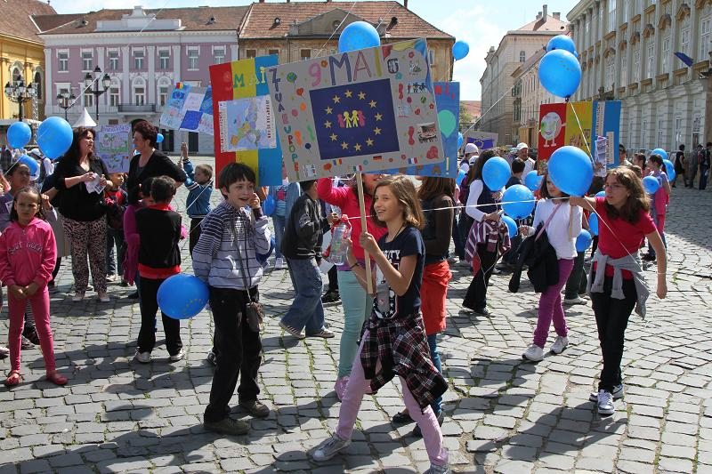 Elevii, veniti de la zeci de scoli din toata Timisoara, au afisat pancarte mari pe care erau desenate steagurile statelor membre UE, cel al Uniunii Europene etc. Prichindeii au pregatit si baloane care au animat atmosfera din centrul Timisoarei.