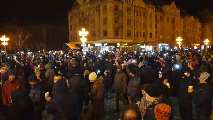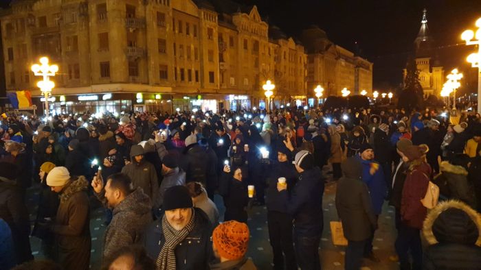 TIMISOARA. Sute de oameni au iesit, duminica seara, in centrul orasului, pentru a protesta fata de modificarile legilor Justitiei, la Timisoara.