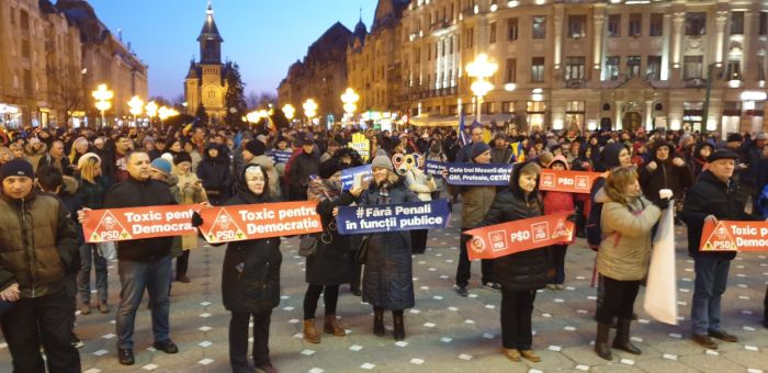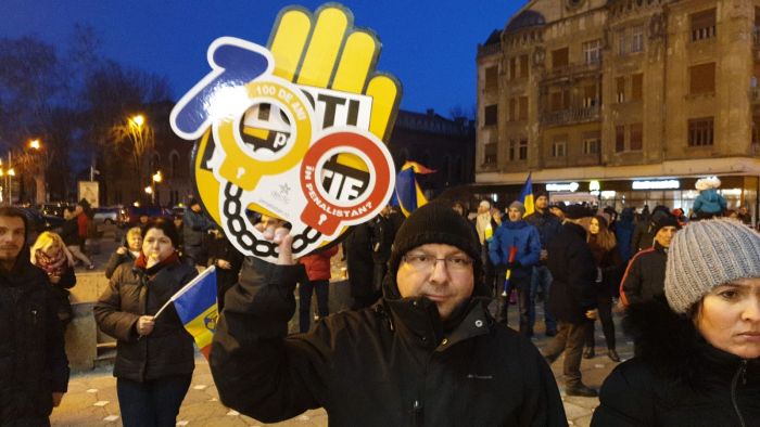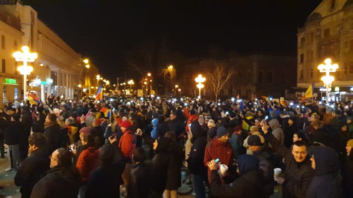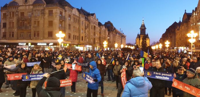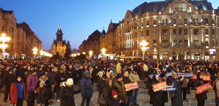 “PSD ciuma rosie”, “Fara penali in functii publice” sau “Jandarmeria apara hotia” au fost din nou lozincile strigate de cei aproximativ 500 de protestatari adunati in Piata Victoriei din Timisoara.