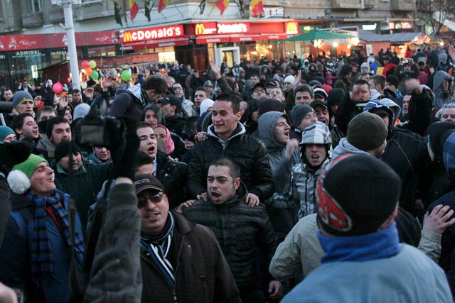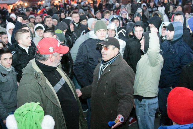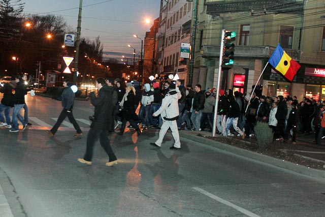 In jurul orei 17, mai multi membrii ai galeriei echipei de fotbal Poli Timisoara, cateva sute, s-au alaturat protestatarilor. Odata sositi in Piata Victoriei, protestatarii, alaturi de suporteri, au pornit in mars inspre Catedrala, apoi inspre Complexul Studentesc pentru a scoate cat mai multi studenti in strada.