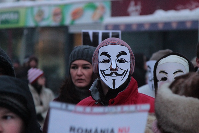 Mai multi tineri si-au lipit pe gura autocolante pe care scrie ”ACTA”, iar altii poarta masti Anonymous, lor alaturandu-li-se revolutionarii care au protestat si pana acum la Timisoara, in Piata Victoriei.
