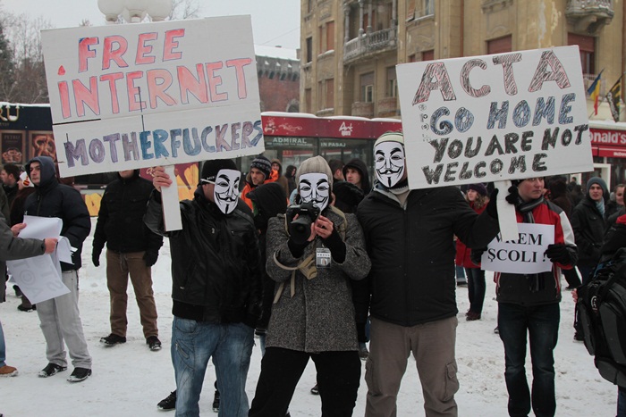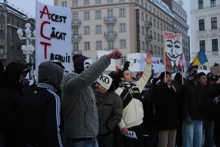 Timisorenii, majoritatea tineri, infrunta gradele scazute de afara si protesteaza in Piata Victoriei, impotriva ACTA. Ei striga ”Jos ACTA” si ”Ole-ola, nou uram ACTA” si poarta mesaje impotriva acestui tratat.