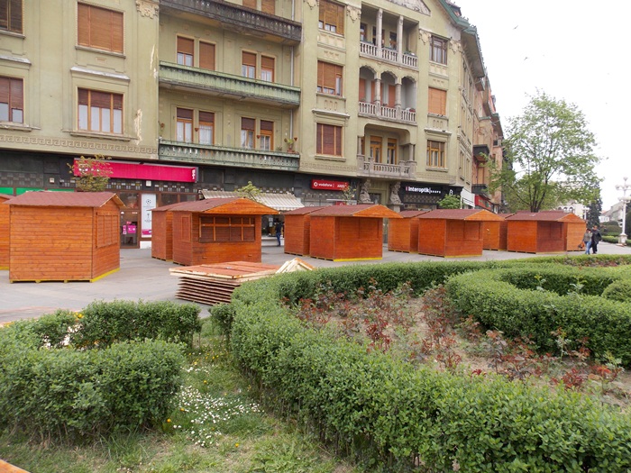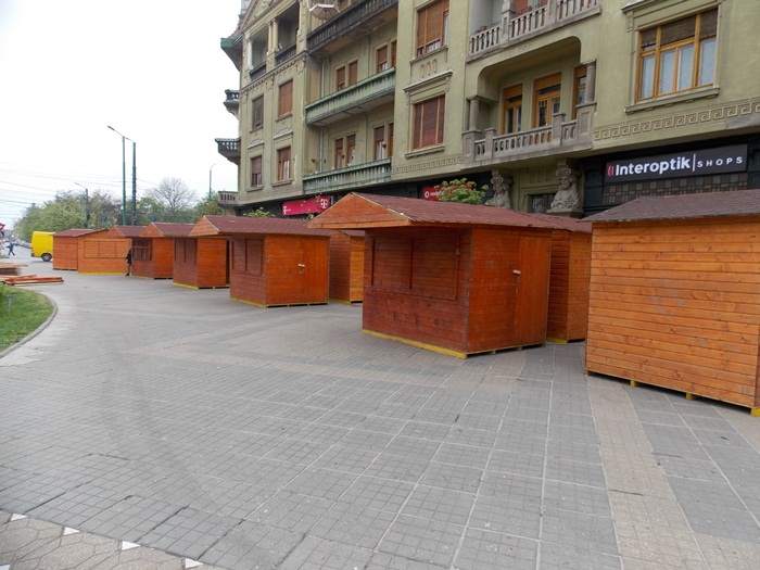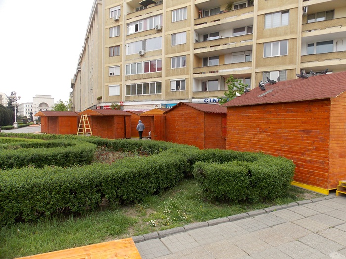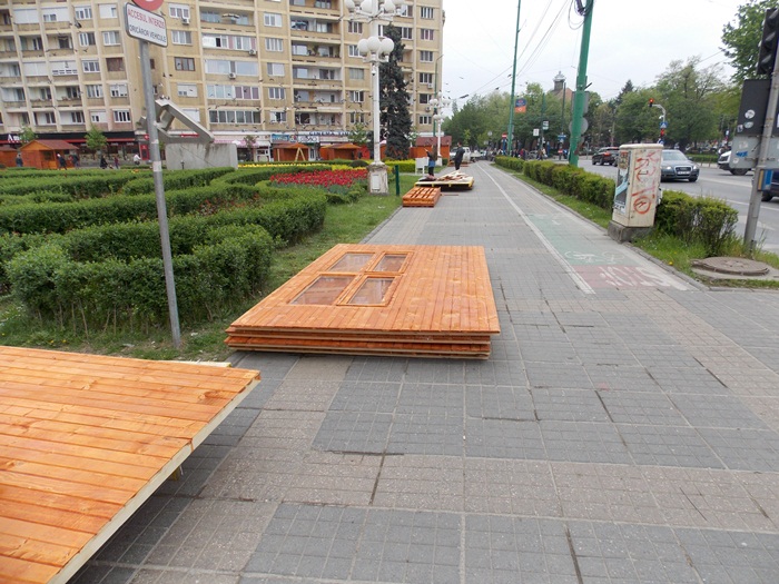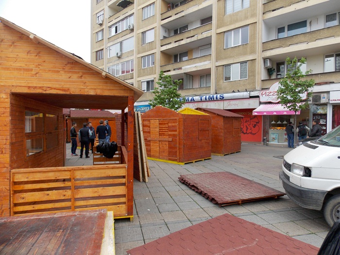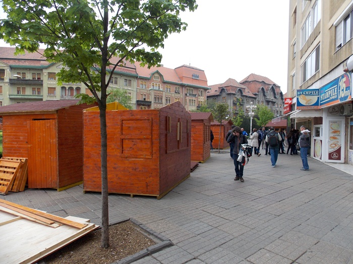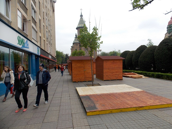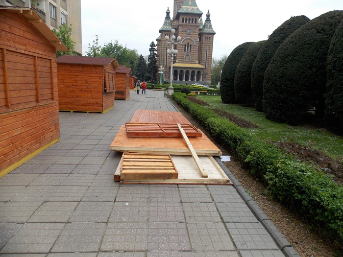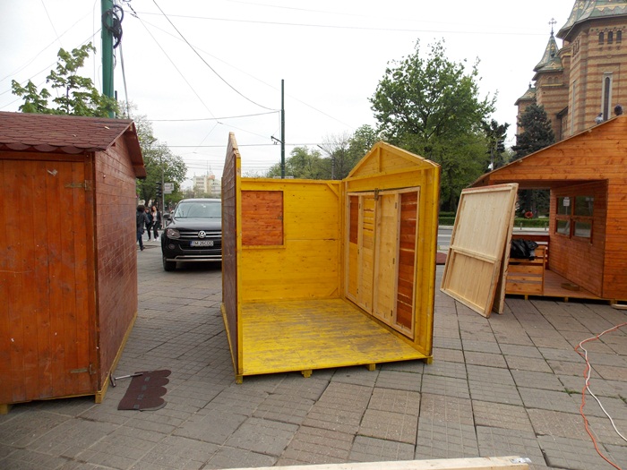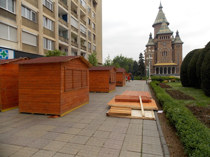 TIMISOARA. Forfota in Piata Victoriei, la Timisoara. Se lucreaza de zor la montarea casutelor pentru Targul de Paste care incepe la finalul saptamanii. Spre deosebire de alti ani, casutele din care se vor vinde tot felul de produse si cadouri nu vor mai fi imprastiate in toata zona dintre Palatul Culturii si Catedrala.