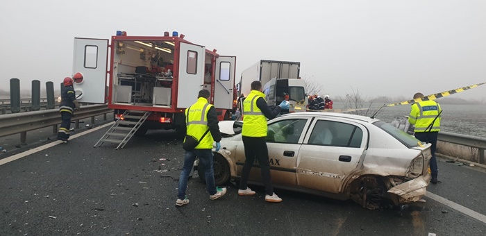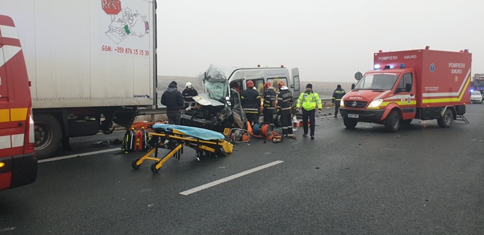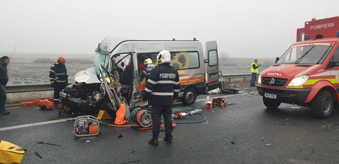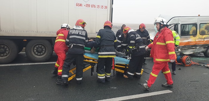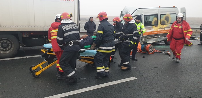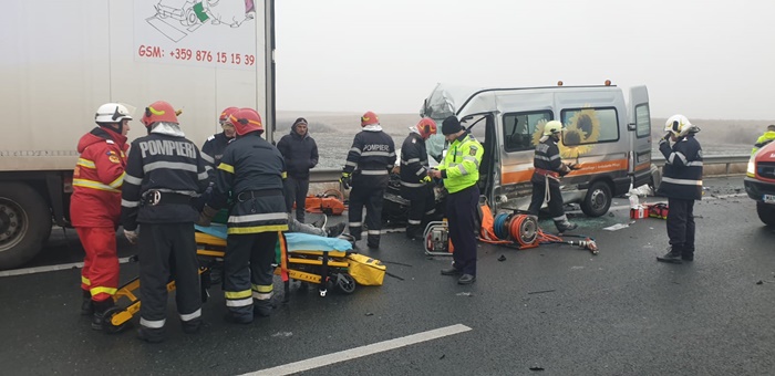 UPDATE: Din primele informatii, autoturismului i s-a rupt o roata, masina scapata de sub control, s-a izbit de parapetele de protectie si a zburat in lateralul tirului, apoi a ajuns aproape de banda de urgenta. Microbuzul n-a mai putut evita impactul si a lovit la randu-i autoturismul, apoi s-a ‘infipt’ in partea din spate a tirului.