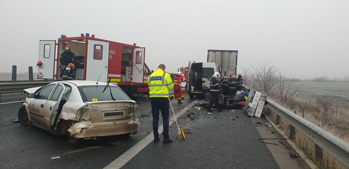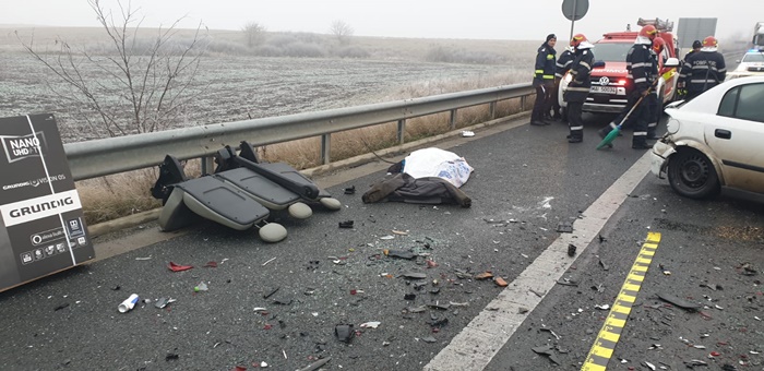 TIMISOARA. Grav accident de circulatie vineri dimineata pe Autostrada Vestului, langa Timisoara. Un tir, o masina si un microbuz, care veneau dinspre Arad, s-au izbit violent, iar in urma impactului un om a murit, iar alti 6 au ramas incarcerati.