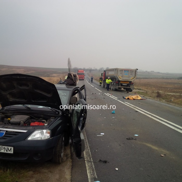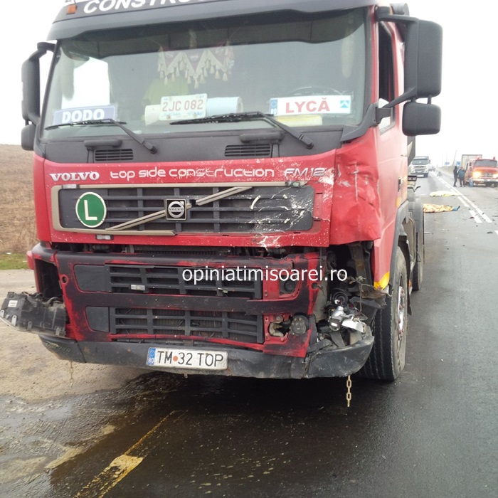 Dacia Logan se indrepta spre Timisoara, povesteste soferul camionului. La un moment dat, barbatul de la volan a incercat sa depaseasca atat o duba de marfa, cat si camionul, insa, nu se stie de ce, a pierdut controlul autoturismului in momentul in care a incercat sa revina pe banda lui de mers, intre cele doua masini mari. Loganul a acrosat usor duba si s-a lovit de camion.