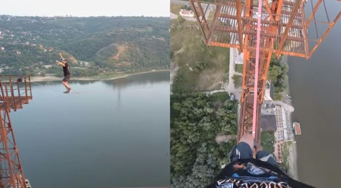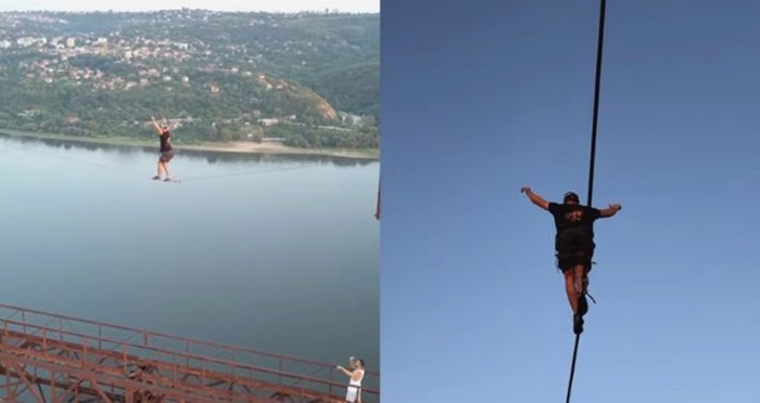 Banateanul a montat o banda de doar 3,5 centimetri latime intre cele doua brate ale stalpului si a mers pe ea la o inaltime de 150 de metri.