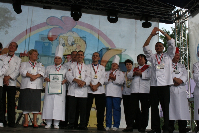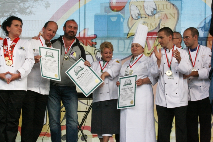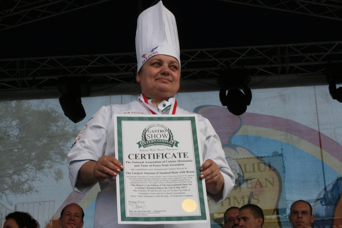 Bucatarii care au pregatit recordul au fost premiati pe scena de organizatorul evenimentului, Radu Zarnescu, care a impartit certificatele internationale Asociatiei Nationale de Gastronomie din Timisoara, unor bucatari din Israel si Asociatiei Catering Moldova. Cu totii si-au dat mana sa stabileasca recordul la cea mai mare mancare de fasole cu ciolan afumat si, la final, au impartit mai bine de o mie de portii de iahnie timisorenilor nerabdatori sa guste delicioasa mancare. Verdictul a fost: „delicios”!