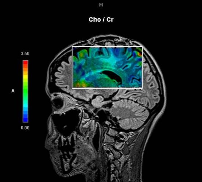 Pacientul intra la RMN ca pentru o investigatie conventionala. Spectroscopia nu se face niciodata fara o investigatie conventionala prealabila. Orice investigatie incepe cu partea clasica, finalul investigatiei inseamna adaugarea secventelor spectroscopice la cele conventionale. Practic, se centreaza regiunea de interes, se fac diferite tipuri de evaluari spectroscopice, rezoneaza anumiti metaboliti la un anumit spectru, iar la al doilea spectru rezoneaza alti metaboliti. La finalul investigatiei avem doua tipuri de spectroscopie. Ele impreuna dau un grafic in care sunt niste varfuri ale unor metaboliti cu valori integrale. Foarte importanta in evaluarea pacientului este evaluarea prin rapoarte ale metabolitilor. De foarte multe ori, leziunile sunt identice pe RMN-ul conventional si atunci diferenta este foarte mare. Atunci cand ai o infectie, o tumora sau o leziune de orice alt tip si este identica pe imaginea conventionala, singura posibilitate este analiza chimica. Sunt atat de mari diferentele din punct de vedere chimic, incat este aproape imposibil sa gresesti. Asta inseamna o sensibilitate de 95%, ceea ce este foarte mult.