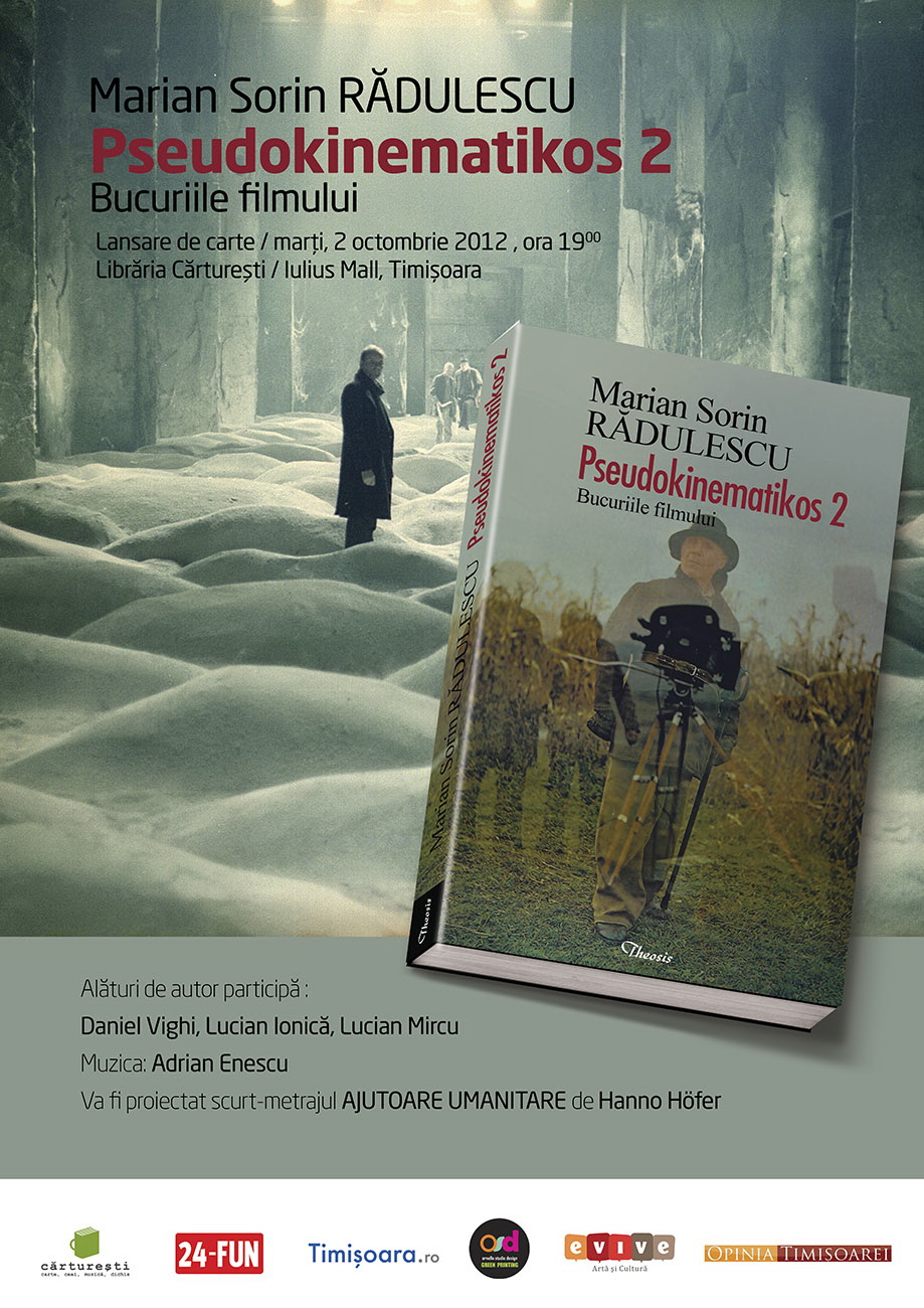 Volumul „Pseudokinematikos 2 – Bucuriile filmului”, semnat Marian Sorin Radulescu va fi lansat marti, 2 octombrie, ora 19, in libraria Carturesti din Iulius Mall. Alaturi de autor vor participa scriitorul Daniel Vighi si cronicarul de film Lucian Mircu.