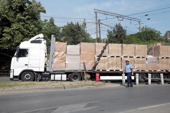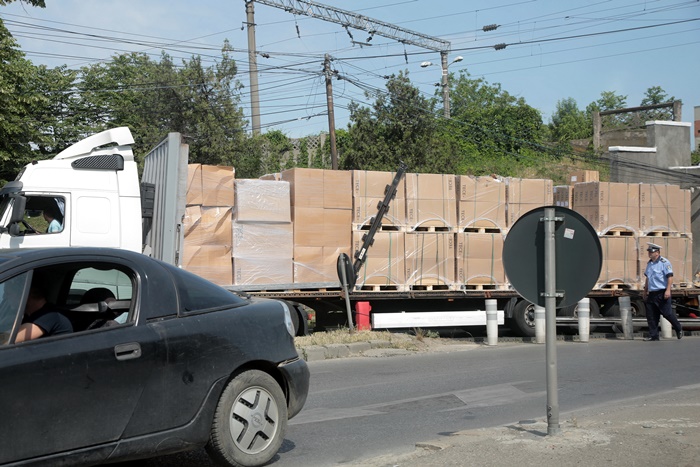 Politistii au supravegheat recuperarea TIR-ului si a incarcaturii de sub pasaj.