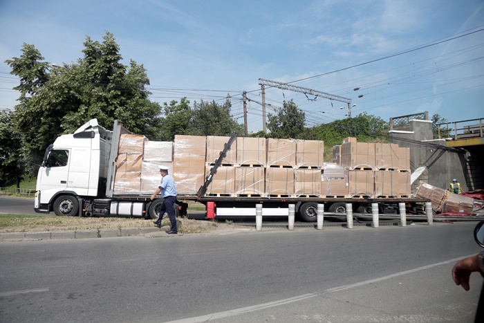 TIMISOARA. Un autotren blocat in Pasajul Jiul si o masina avariata. Acesta este bilantul unui accident petrecut dimineata, in apropierea Garii de Nord din Timisoara. Soferul TIR-ului s-a aventurat prin pasaj cu o remorca de 4 m, desi inaltimea maxima a vehiculelor care pot traversa este de doar 3,7 m.