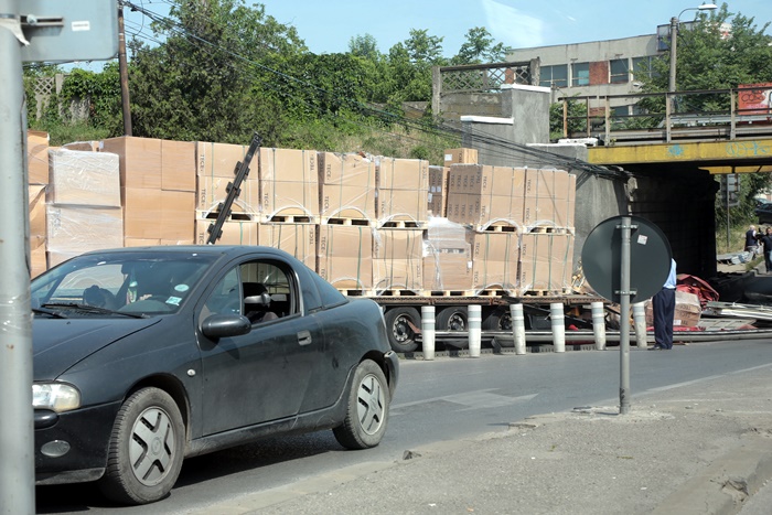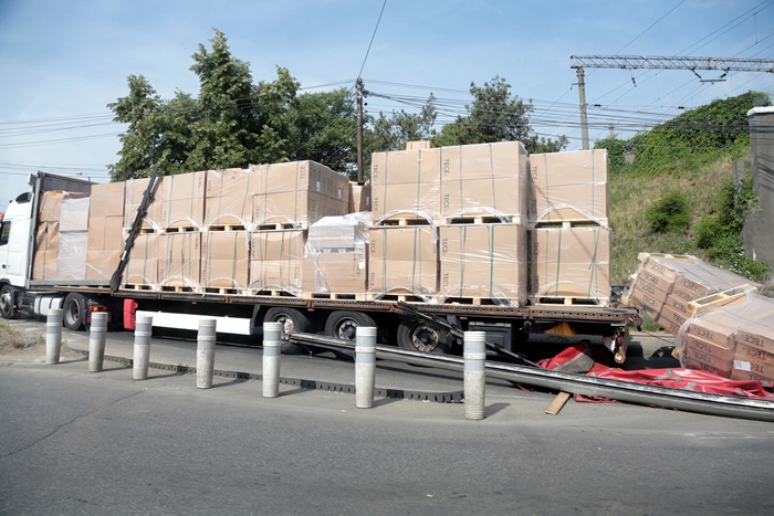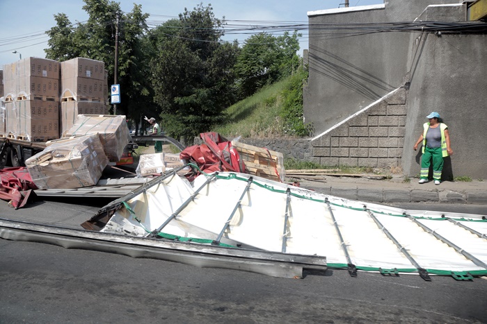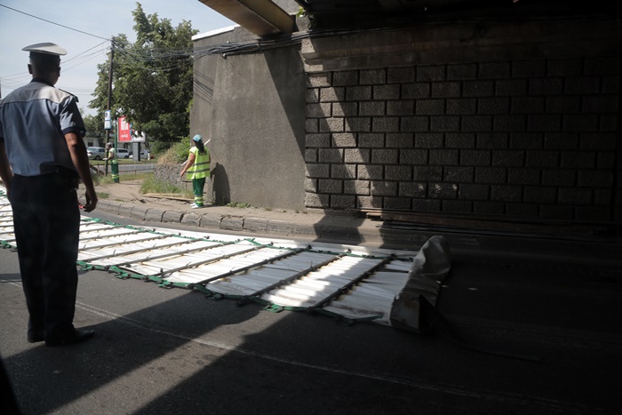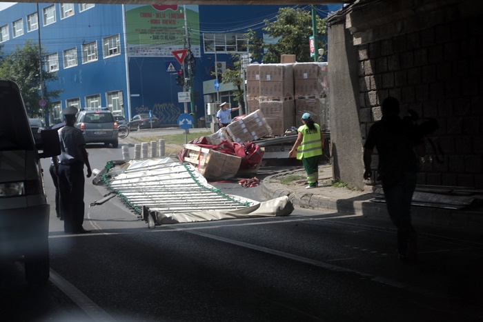 Asa ca, inevitabilul s-a produs. Incarcatura s-a frant, mai multi paleti pe care ii transporta s-au prabusit si au ajuns si peste o masina care trecea chiar in acel moment prin pasaj, pe cealalta banda de circulatie.