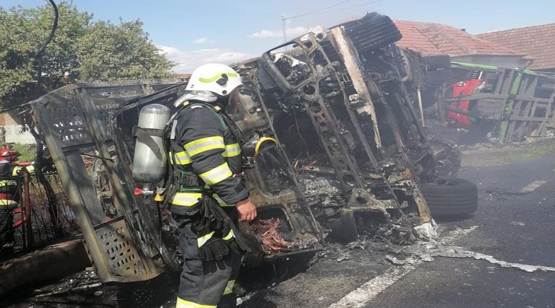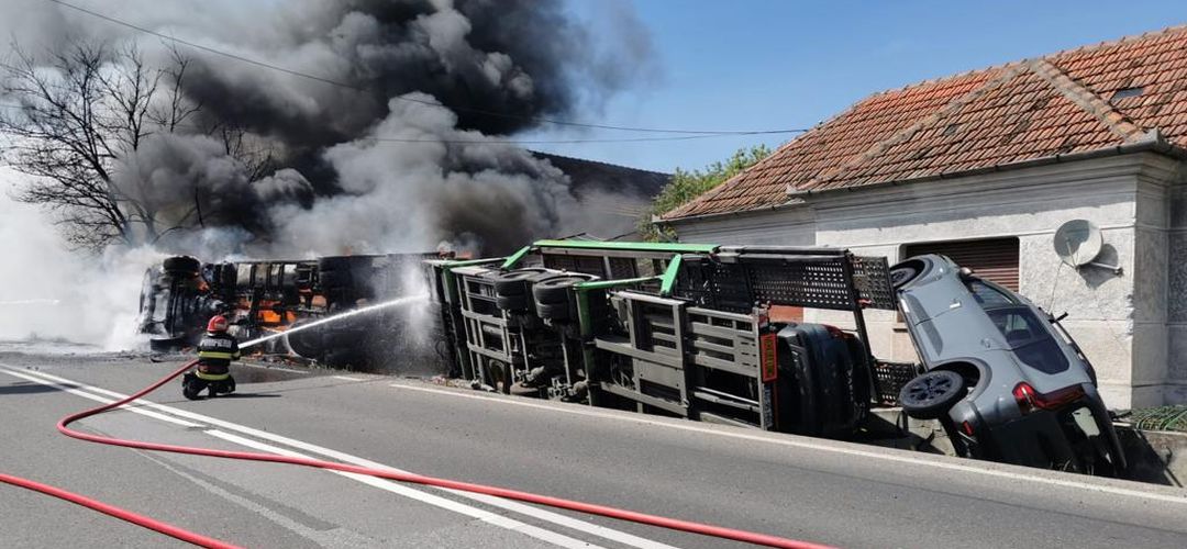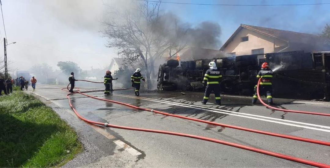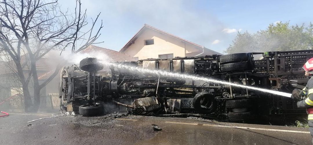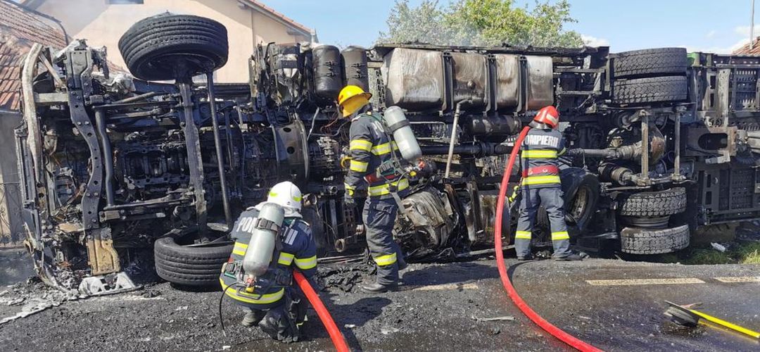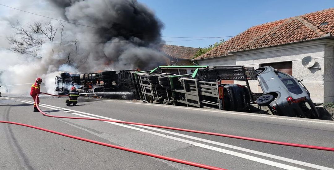 In urma accidentului a izbucnit si un incendiu, care a distrus patru din autoturismele aflate pe platforma tirului, celelalte fiind avariate in urma impactului.