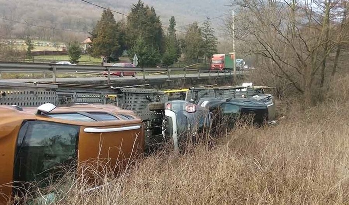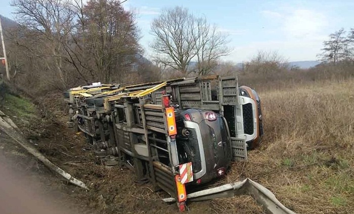 Soferul unui tir circula luni dimineata dinspre Deva catre Arad si transporta masini Dacia Duster. In zona localitatii Vetel, remorca mastodontului a intrat in balans, iar soferul nu a mai putut controla tirul.