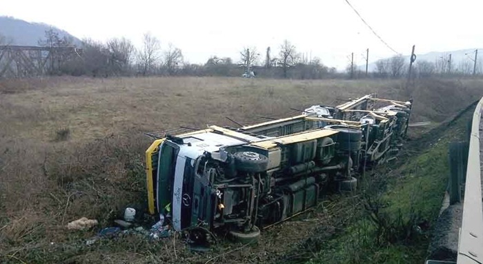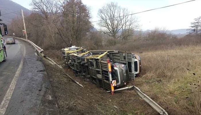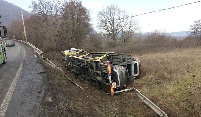 Camionul a trecut fara probleme prin prin parapetul de pe marginea soselei si s-a rasturnat in sant.