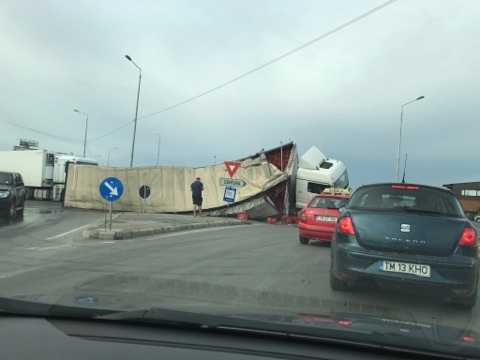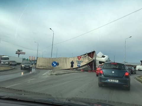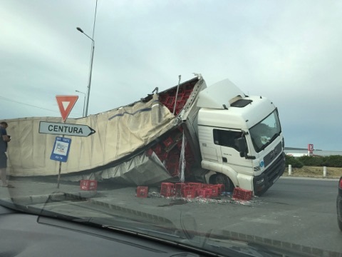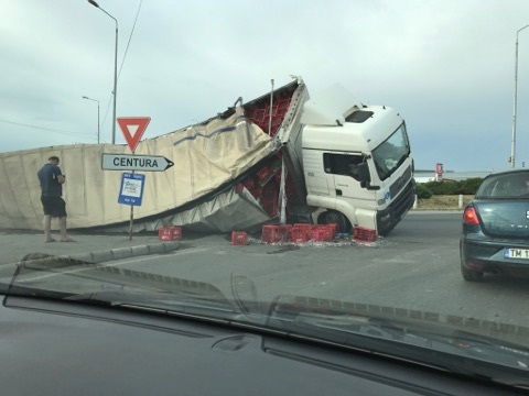 Soferul unui tir plin cu bauturi racoritoare a plecat la primele ore ale diminetii catre Arad. La iesirea din Timisoara pe Calea Aradului, conducatorul auto a incetinit pentru a trece prin sensul giratoriu din zona, insa incarcatura din remorca a intrat in balans. Remorca s-a rasturnat pe partea dreapta, iar mare parte din navetele pline cu bauturi racoritoare s-au imprastiat pe sosea. Tirul nu s-a rasturnat in totalitate, capul tractor ramanand ridicat pe partea soferului.