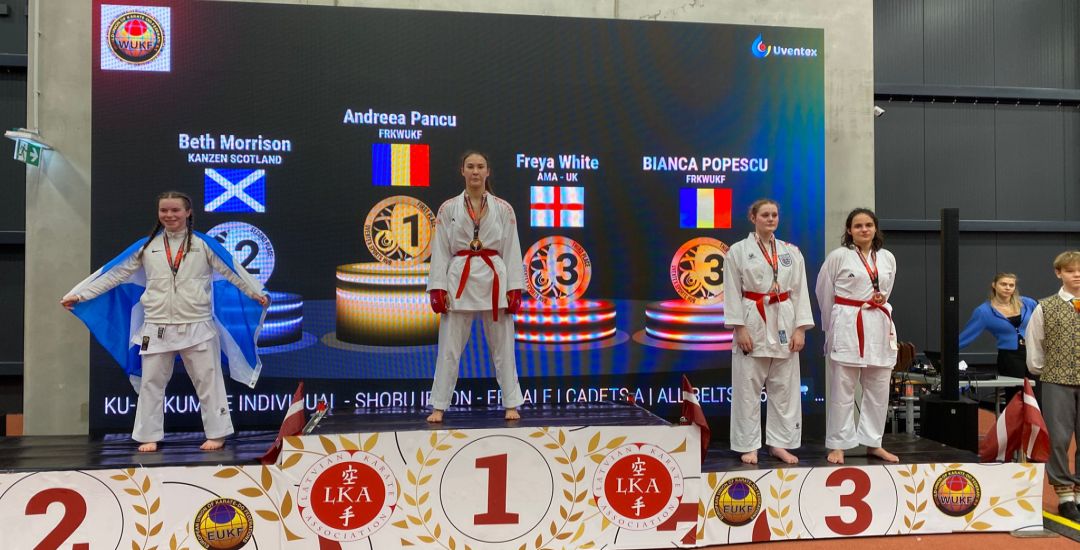 La categoria 16 – 17 ani, Andreea Pancu a devenit campioană continentală la proba Kumite Individual Shobu Ippon, Kumite Echipe si Kumite Echipe Rotativ
