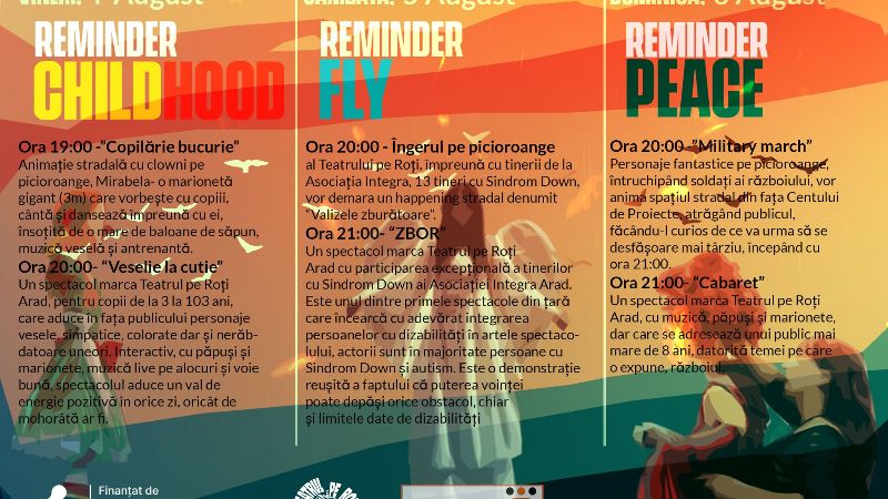 Prima zi vorbește despre întoarcerea la copilărie, a doua zi, despre „zborul oamenilor, frânt datorită lipsei curajului și lipsei încrederii că totul pornește de la simplul «încerc, vreau, pot»”, iar acest curaj îl găsim cu ajutorul persoanelor cu dizabilități, sindrom Down și autism, iar a treia zi propune o temă care nu am crezut și nu ne-am dorit niciodată să redevină atât de actuală, dar iată că ea este: războiul.