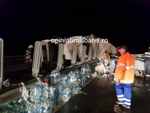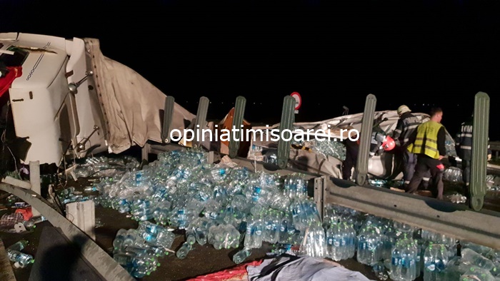 TIMISOARA. Grav accident pe autostrada, luni seara. Un tir incarcat cu apa minerala s-a rasturnat in mijlocul soselei de mare viteza.