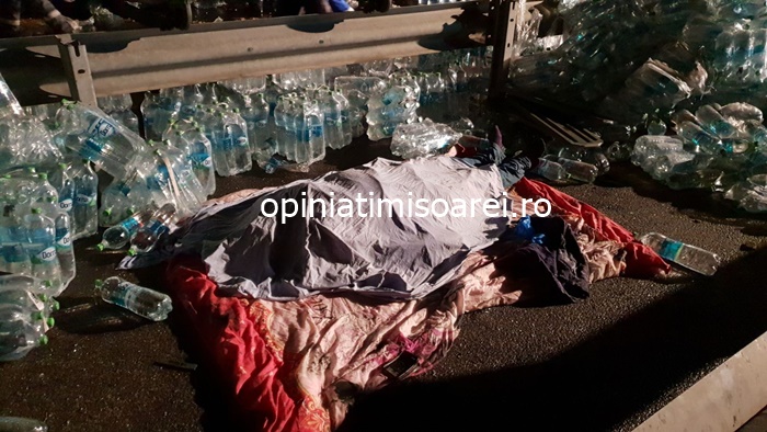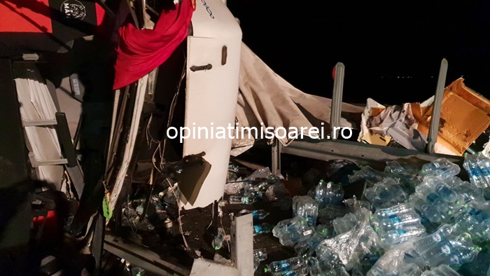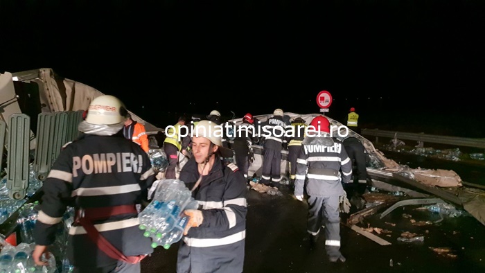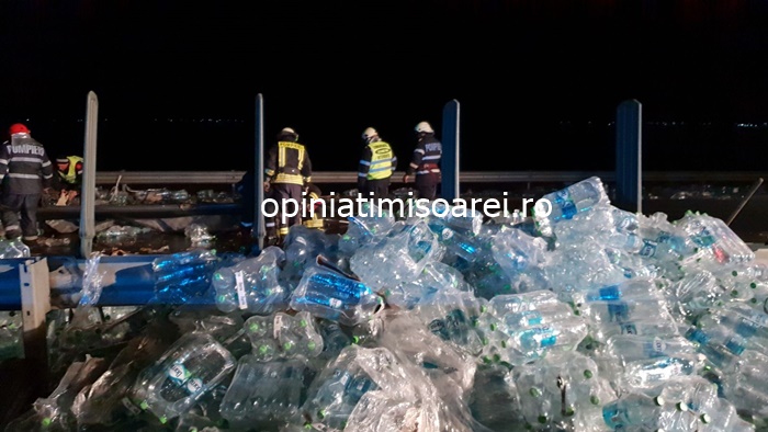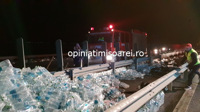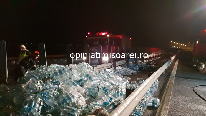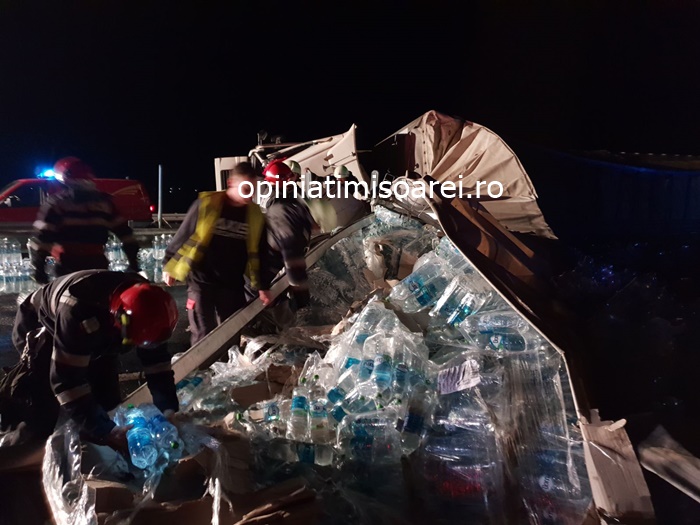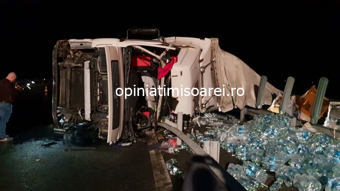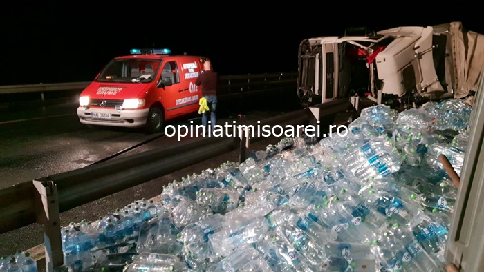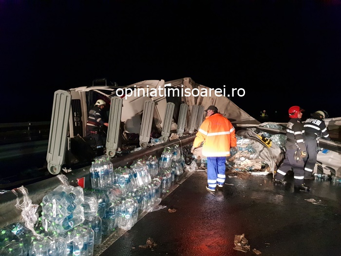TIMISOARA. Grav accident pe autostrada, luni seara. Un tir incarcat cu apa minerala s-a rasturnat in mijlocul soselei de mare viteza.