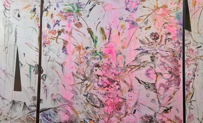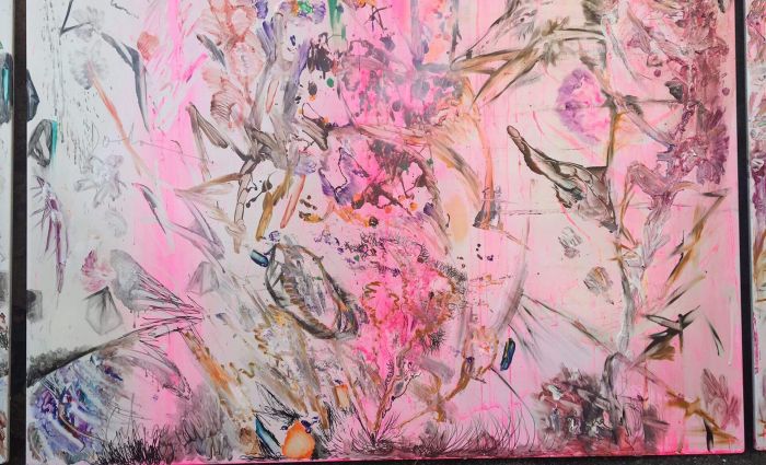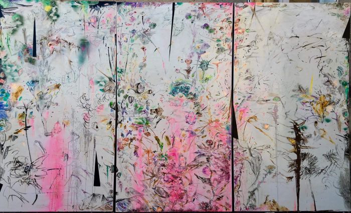 ”Este o lucrare dedicata tuturor celor care au trecut pe aici, unii inca vii, altii morti; am scris numele lor pe lucrare si le-am facut cu saliva, culori si cafea, un tort cu glazura de spini”, declara artistul.