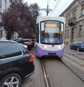 Garniturile care circulau dispre Piata Nicolae Balcescu spre Piata Maria au fost oprite minute bune, joi dimineata, dupa ce o soferita si-a parcat masina pe strada Gheorghe Doja, iar spatele autoturismului era prea aproape de liniile de tramvai si impiedica mijloacele de transport in comun sa treaca mai departe.