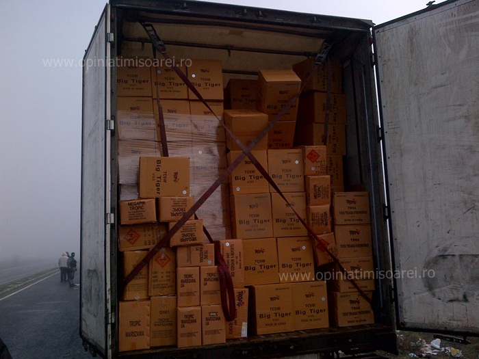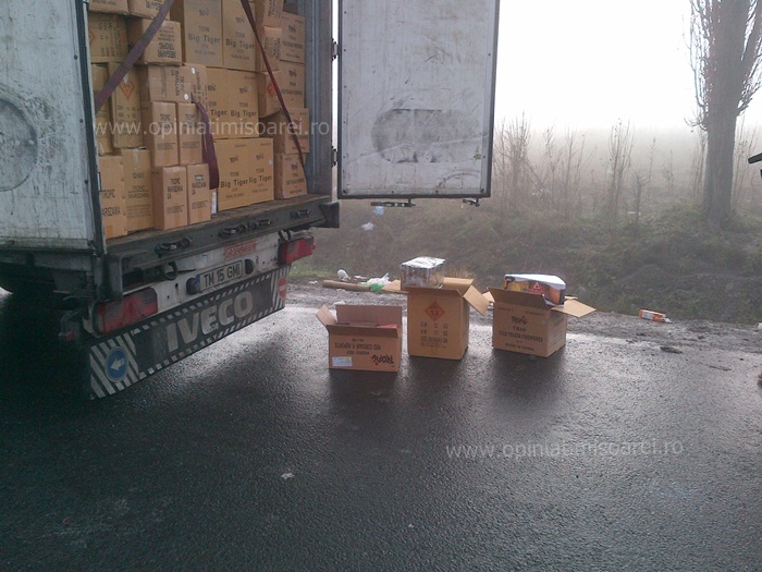 Ofiterii IGPR au oprit un tir pe Calea Lugojului, dar si un microbuz. Soferul tirului se jura ca habar nu avea ce transporta si ca a preluat toata marfa dintr-o alta masina care s-a defectat pe centura Timisoarei. Barbatul spune ca a fost angajat doar sa transporte si ca nu are nicio legatura cu transportul ilegal.