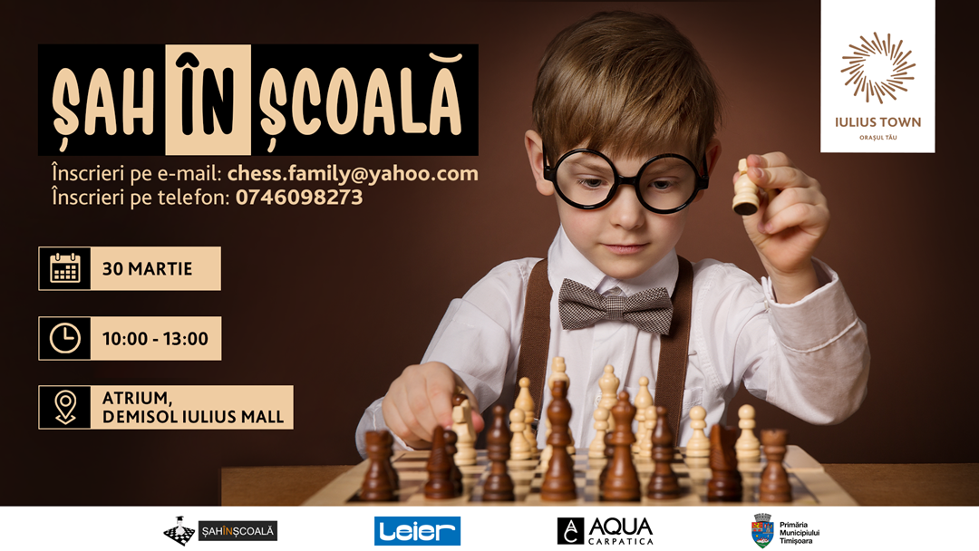 Tot sâmbătă, în Atriumul Iulius Town are loc și competiția Șah în Școală. Turneul este dedicat pentru toate nivelele de experiență, scopul evenimentului fiind promovării șahului în rândul elevilor. Șah în școală va începe de la ora 10.00, iar cei mai iscusiți jucători își vor pune în evidență aptitudinile de a anticipa mișcările adversarului, dar și gândirea strategică.