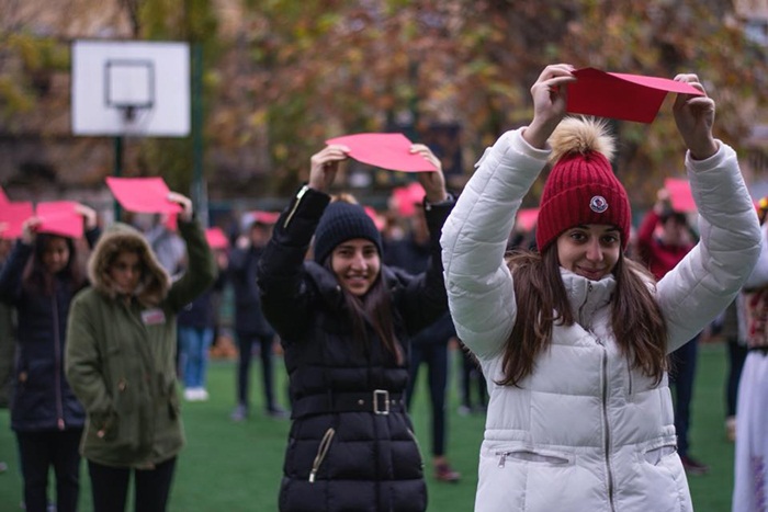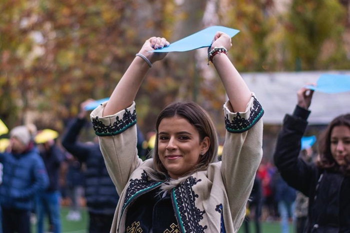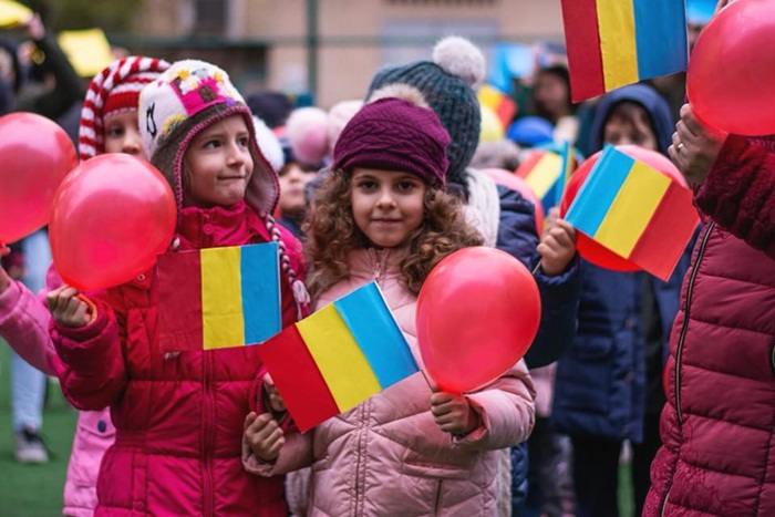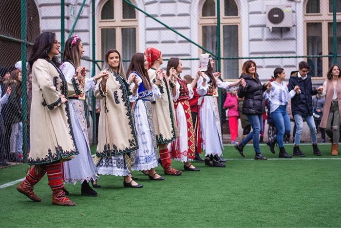 TIMISOARA. Elevii Colegiului National Banatean au sarbatorit Centenarul cu dans, muzica si un tricolor imens pe care l-au ‘compus’ in curtea scolii.