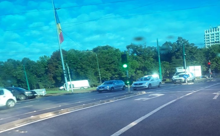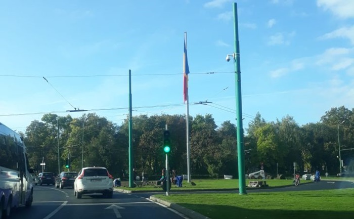 TIMISOARA. Aparitie neasteptata intr-o intersectie din Timisoara. Un tricolor de mari dimensiuni a fost instalat pe scuarul dintre strada Michelangelo si b-dul Bratianu, in centrul orasului.