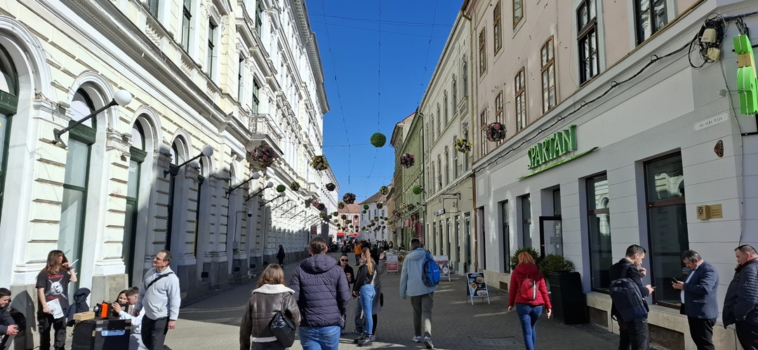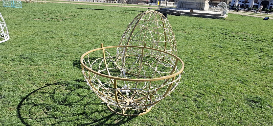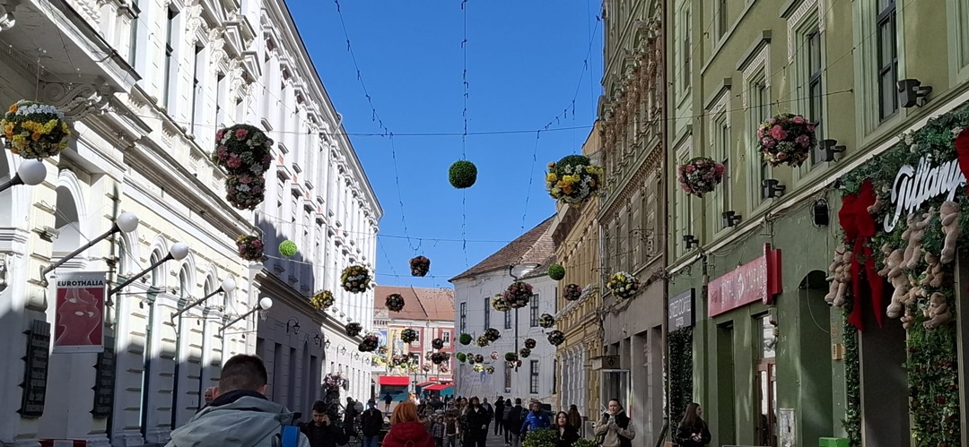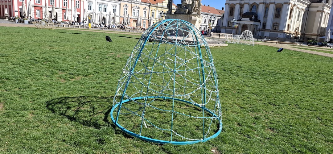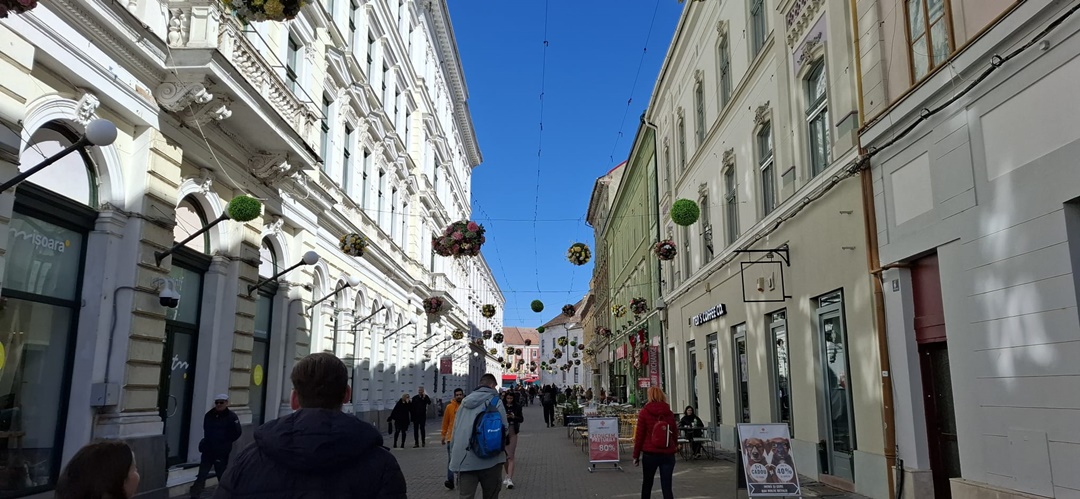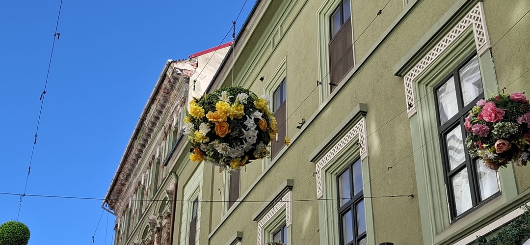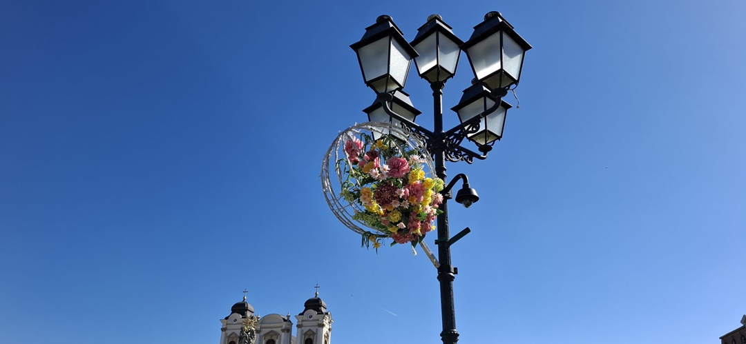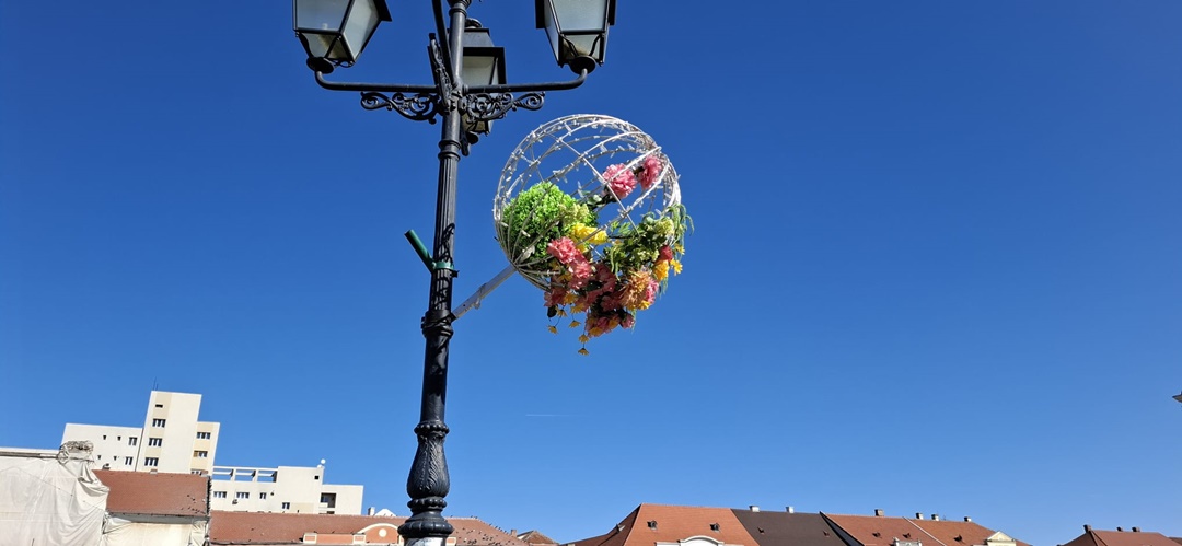 În Piața Libertății au fost montate căsuțe, dar se lucrează de zor și în Unirii. Aici, pe stâlpii de iluminat, au fost montate alte globuri cu flori, iar pe alei au fost puse decorațiuni de Paști, un iepuraș sau ouă, împodobite cu instalații.