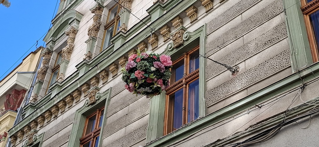 De asemenea, pe strada Alba Iulia, în locul unde în urmă cu ani aveam acoperișul de umbrele multicolore, au fost aninate globuri cu flori din plastic decorative, de la un capăt la celălalt.