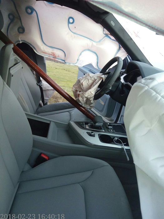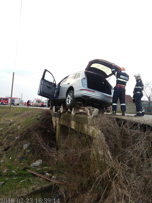 Din fericire nicio masina nu circula in acel moment din sens opus. Bariera de metal a podului a fost cea care a oprit masina sa nu ajunga in sant.