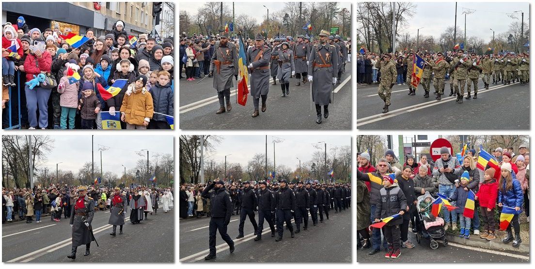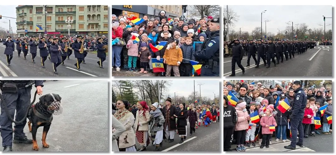 În ritmuri de fanfara, prin fața celor prezenți au trecut militari ai Brigăzii 18 ISR Decebal, jandarmi, polițiștii de penitenciare, pompierii de la ISU Banat, polițiști din cadrul IPJ Timiș, plutoane de polițiști de Frontieră Timișoara, polițiștii locali.