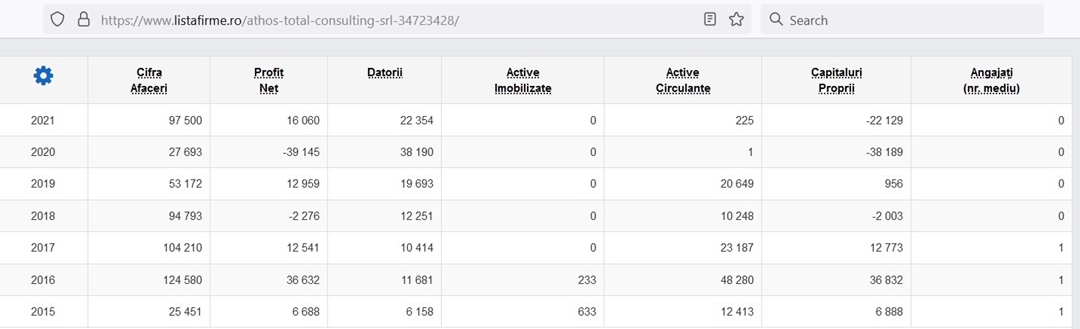 Bine, conform bilanțului depus la Ministerul Finanțelor, în ultimii patru ani (2018-2021), Athos Total Consulting a avut zero angajați!