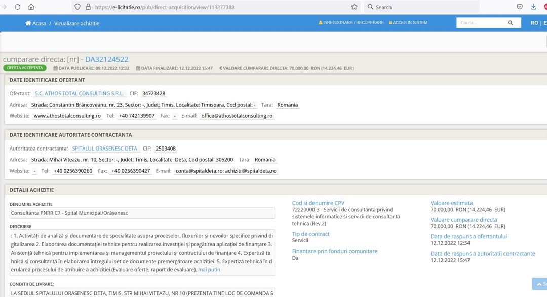 TIMISOARA. Printre zecile de contracte obținute de una dintre cele două firme protagoniste ale articolului publicat, recent, pe site-ul www.info-sud-est.ro și intitulat “Consultanță copy-paste pe banii UE: Firmele nașei lui Alfred Simonis și a verișoarei ei, contracte pe bandă rulantă din PNRR și ITI Delta Dunării/ Doar în două zile au luat 14 contracte/ Rapoartele conțin inclusiv aceleași greșeli’ se numără și unul încheiat cu o entitate publică din județul Timiș. Ne referim la achiziția directă făcută chiar zilele trecute, în 12 decembrie, de Spitalul Orășenesc Deta, care plătește 70.000 de lei (14.224 euro), din fonduri PNRR, către SC Athos Total Consulting SRL din Timișoara. Firma are doi asociați, dintre care unul este, conform informațiilor publicate de site-ul tulcean, Ramona Dorica Pop, verișoara nașei de cununie (Camelia Veronica Huțan) a lui Alfred Simonis, deputat PSD de Timiș.