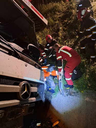 Salvatorii l-au gasit pe sofer incarcerat si lesinat, dar in viata. L-au recuperat din cabina si l-au transportat de urgenta la spital.