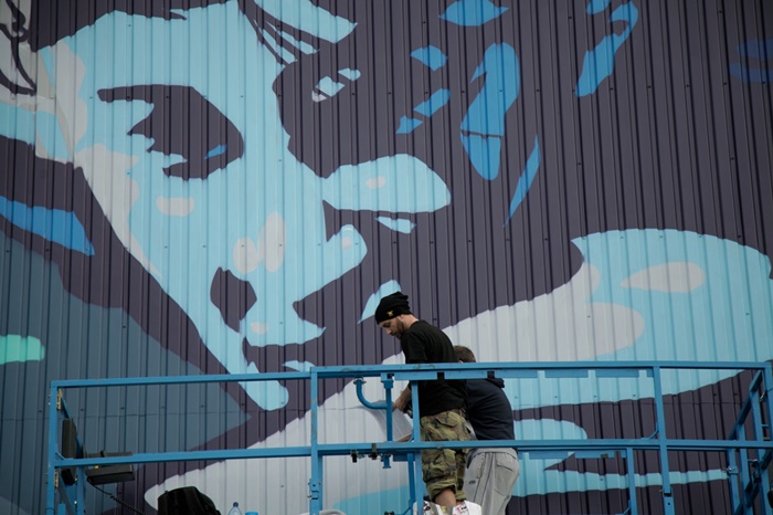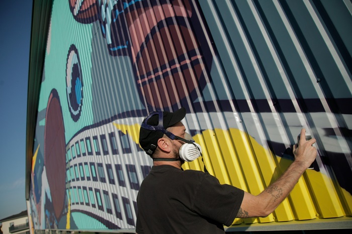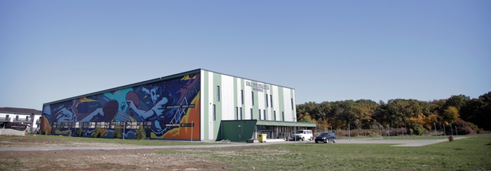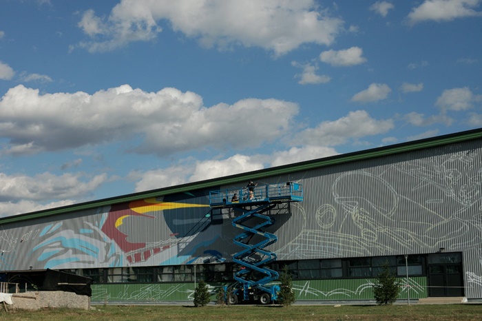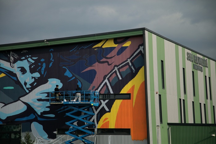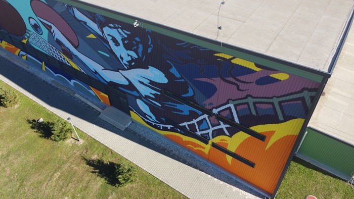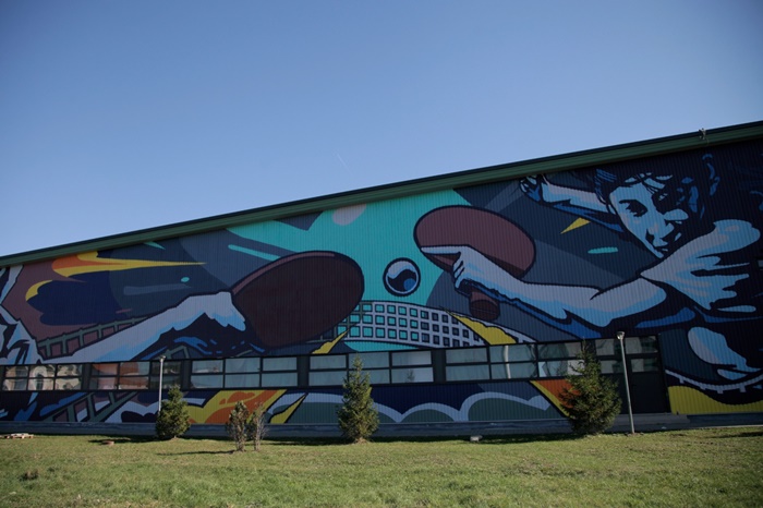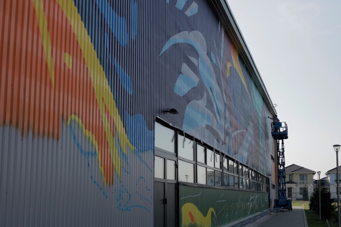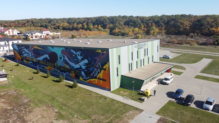 Andrei Dragan, un artist timisorean cunoscut sub pseudonimul LUX, a realizat o pictura murala de aproape 600 de metri patrati pe sala polivalenta de la Dumbravita.