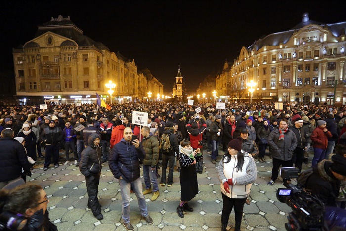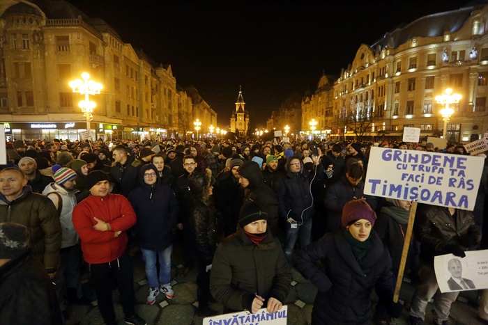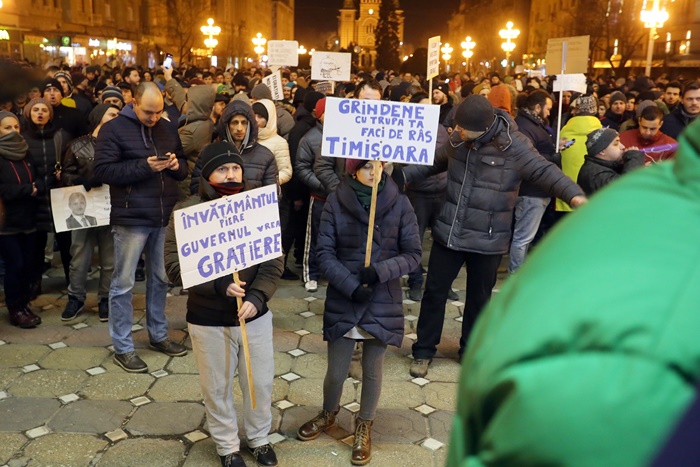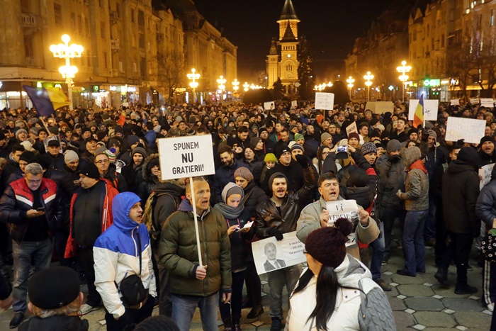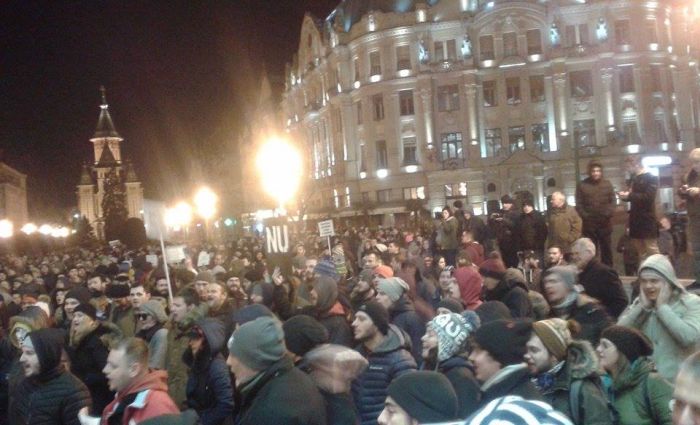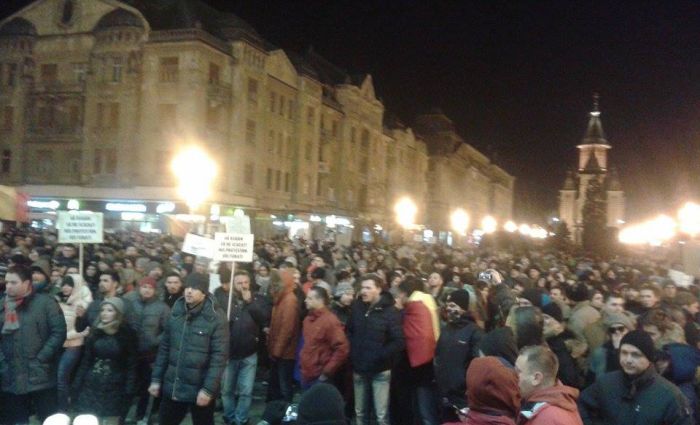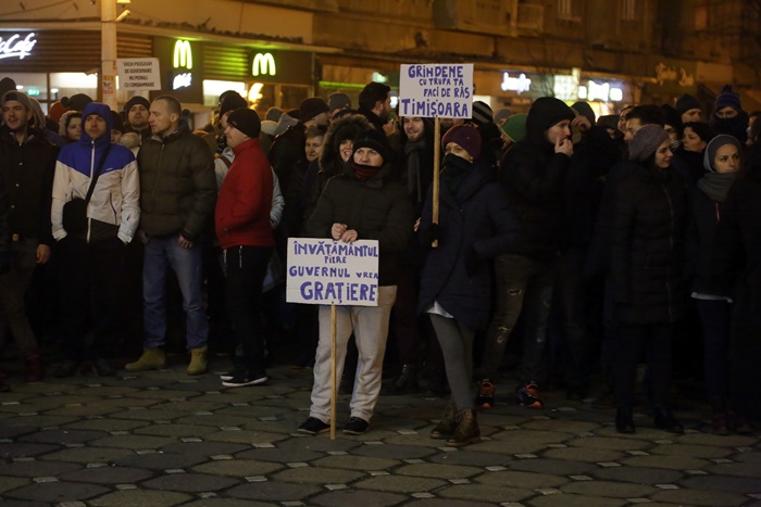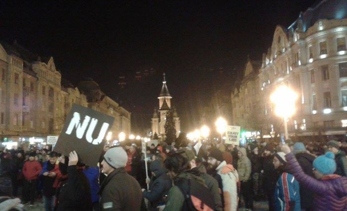 UPDATE 1: In Piata Operei din Timisoara oamenii continua sa scandeze. Manifestantii protesteaza fata de deciziile anuntate marti seara de ministrul Justitiei, Florin Iordache. Timisorenii continua sa scandeze impotriva Guvernului, iar lozinci precum “Vrem anticipate nu hoți în palate”, “Tradatorii”, “Nu cedam”, “Dragnea unde esti? Venim la Bucuresti!”, “Dragnea nu uita poarta alba e casa ta”, “Pana dimineata scăpam de mustata” si “Grindeanu Tradator” se aud in centrul orasului.