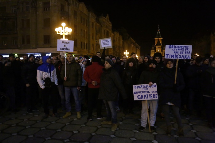 TIMISOARA. Imediat dupa ce Guvernul a anuntat adoptarea Legii gratierii si a Ordonantei de Urgenta care prevede modificarea Codurilor Penale,peste 1000 de timisoreni au pornit spre centrul orasului, in Piata Victoriei, acolo unde au protestat, in ultimele doua saptamani, impotriva adoptarii acestor acte normative.